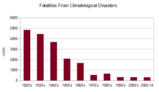 According to the Centre for Research on the Epidemiology of Disasters (EMDAT), which he quotes, the death toll in the last two decades has been stable and running at a fraction of earlier decades.