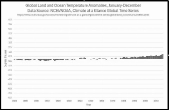 It would seem reasonable, then, to depict global temperature anomaly data on a vertical scale of, say, halfway between the low and high ranges, i.e., 16.7°C (30°F). And, to complete our avoidance of psychological scare tactics, we’ll jettison the color scheme and use a neutral color.